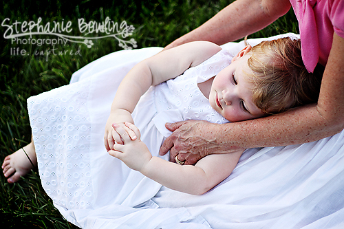 Stephanie - they are simply beautiful. What a great gift you have given these grandparents. You have inspired me to convince my mom to do a session with my kiddos! I love the 4th image where the little girl is lying in Grandma's lap. The one with the flowers in focus in the foreground is breathtaking, and I love, love,love the one with Grandpa's hand holding the little hand.